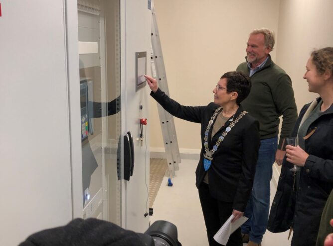 Ordfører Britt Helstad trykket på startknappen og takket Clemens Kraft for etablering i Bindal og det gode samarbeidet under planleggingen og gjennomføringen av prosjektet.